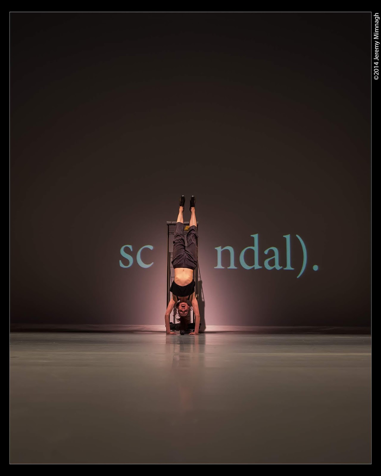 The conceptual foundation of the book is based on the constraint of using only one vowel at a time for each chapter of the book. We adopted versions of this constraint in all aspects of the creation of the performance, in the movement vocabulary, the music, video, costumes, etc. This was debilitating and I was concerned that I would not be able to create much of note when restricted, for example, to A body parts, ie. hand, arm, scalp and jaw, and to A movements like clap, stamp, smash and grab. The same was true for the other collaborators who had their own constraining lists. But we eventually found that the constraints forced us to look for solutions in novel ways and spurred us into new and creative ways of inventing!